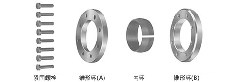SL系列的锥形环A、B的内径面及内环的外径面为锥形面,通过拧紧紧固螺栓,使锥形环A、B在锥形面上滑动。