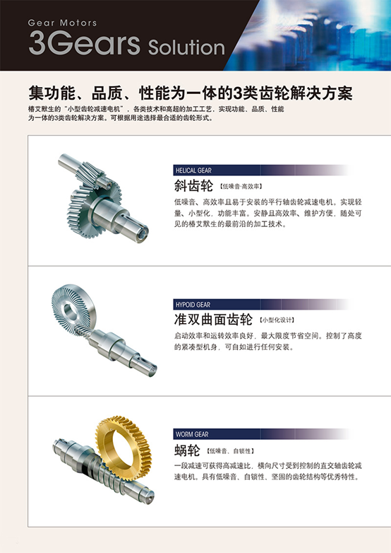 电机容量40W~5.5kW的小型齿轮减速电机系列。齿轮电机(斜齿轮)、准双曲面齿轮电机(准双曲面齿轮)、CROISE减速电机(蜗轮蜗杆齿轮),共3类齿轮都有分别使用的齿轮电机。